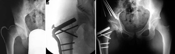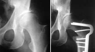 A osteotomia intertrocantérica rotacional é feita de forma a colocar a região necrótica da cabeça femoral fora da área de suporte de carga.