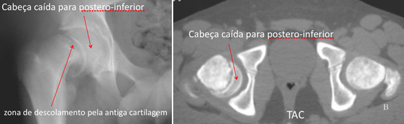 O que aconteceu na epifisiólise foi um descolamento pela zona da cartilagem de crescimento, com o subsequente deslizamento da cabeça para baixo e para trás (para posteroinferior) em relação ao colo femoral.